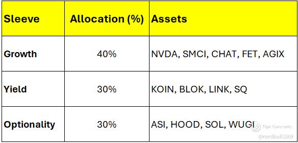 Tilt: Favoring growth + optionality with moderate yield ballast. AI-crypto convergence plays dominate upside exposure.