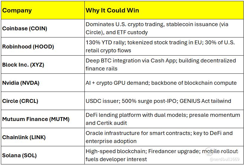 Implication: Stocks with real infrastructure, custody, or payment rails—not just speculative exposure—are best positioned.