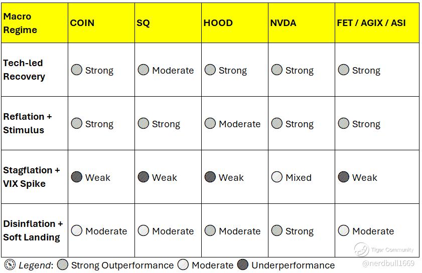 COIN and NVDA consistently outperform in tech-led and reflationary cycles.
