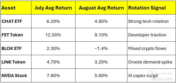 Interpretation: July–August favors AI-led growth and infrastructure tokens. BLOK shows seasonal weakness in August, suggesting tactical trimming.