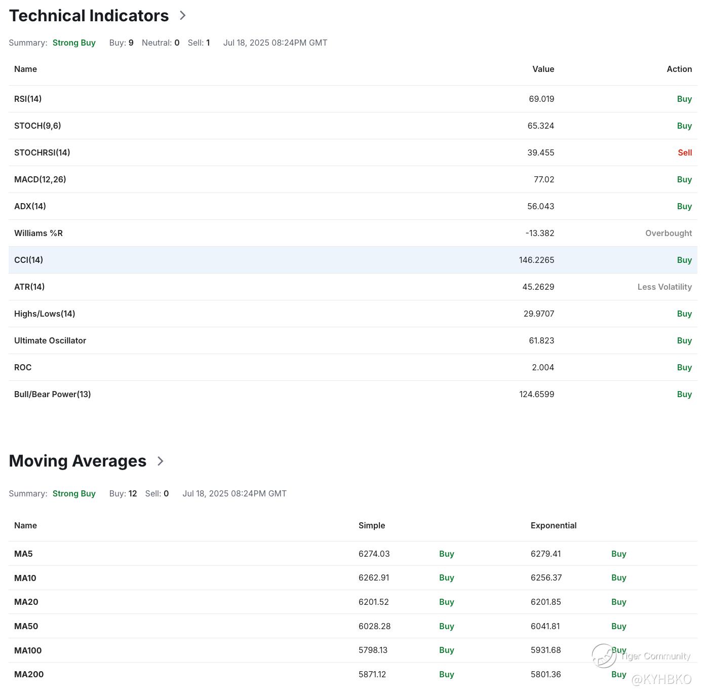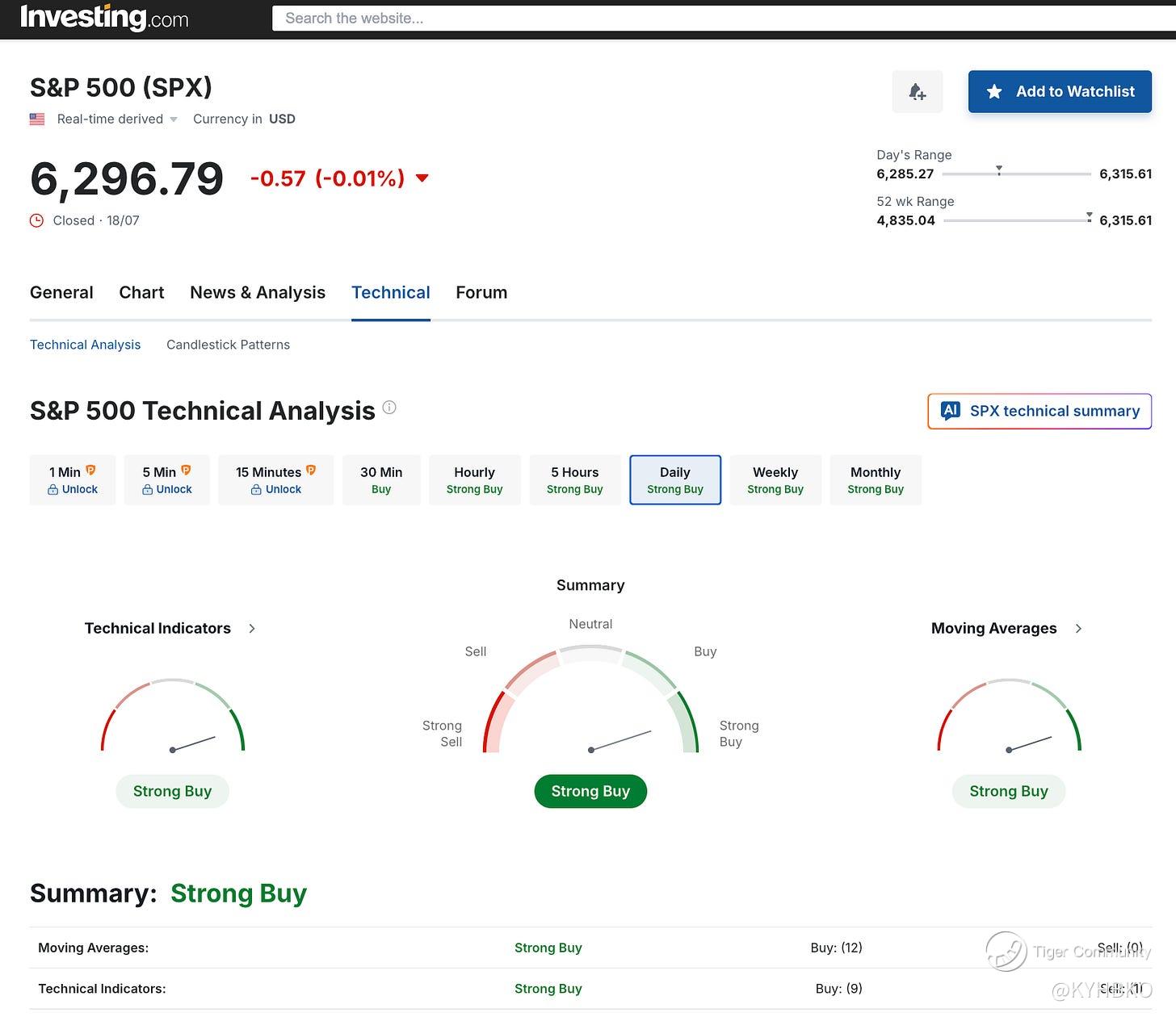 Using a daily interval, SPX has a “Strong Buy” recommendation. 21 indicators show a “Buy” rating and 1 shows a “Sell” rating.