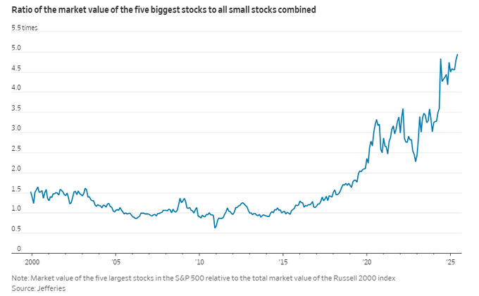 1.The market value of the 5 biggest S&P 500 $S&P 500(.SPX)$ stocks relative to all small-cap stocks just hit a new all-time high 🚨
