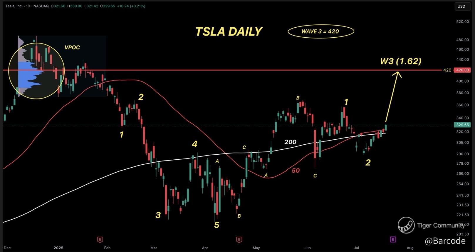 The breakout trigger remains $350. This level aligns with peak gamma exposure, and if reclaimed, the pattern suggests potential for a rapid move toward $375 and then $420, the 1.62 Fibonacci extension and Elliott Wave 3 target, further confirmed by harmonic Crab structure. The setup points to a possible impulsive breakout rather than a slow grind.