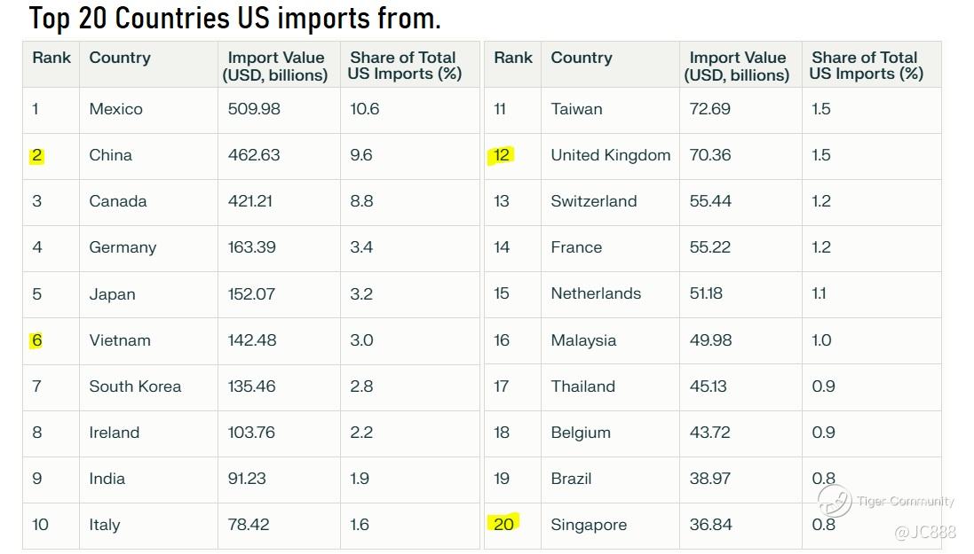 Of the top 20 countries that US import (most) from, only 4 countries (20%) have a trade deal with the US. Both Singapore & China have not signed the trade deal yet. UK has an agreed framework.
