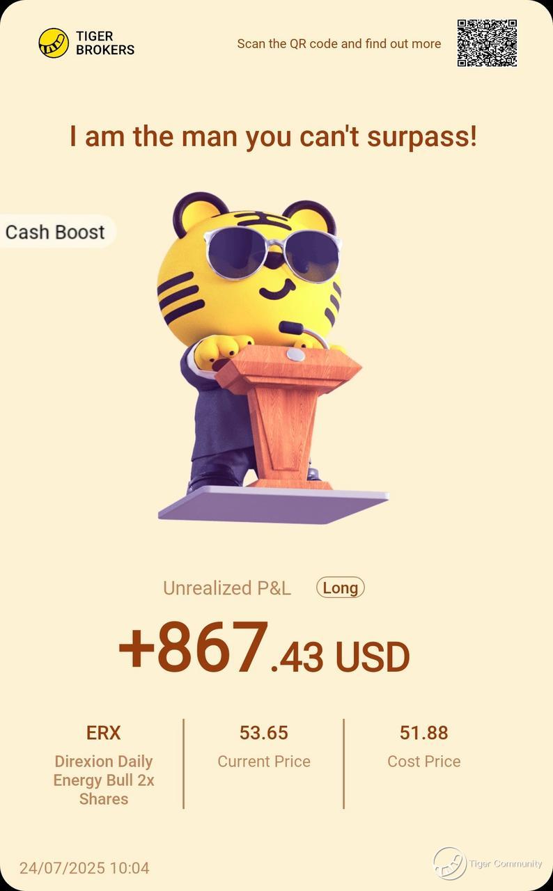 $Direxion Daily Energy Bull 2x Shares(ERX)$ timing worked! Geopolitics + summer demand boosted 2x energy play. Trimmed 30% as policy risks loom, watching OPEC+ moves.
