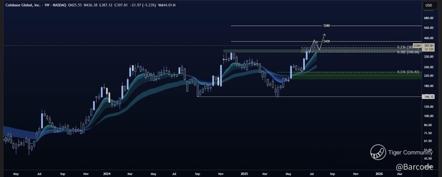 Coinbase ($COIN) is now deep into a bullish continuation setup. The inverse head and shoulders neckline breakout around $387 was retested this week and is holding firm. The current inside bar forming on the weekly suggests healthy indecision, not weakness. With price consolidating between $387 and $400, the conditions are aligning for a breakout toward the $430 measured move. Weekly fib targets from two separate structures point toward $430 and $580.