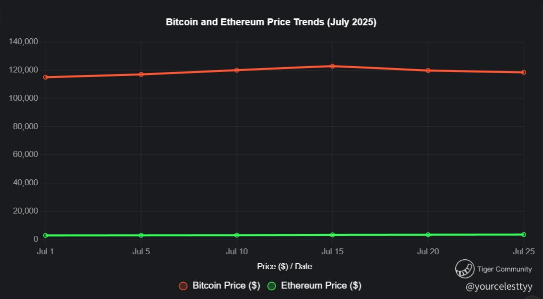 The chart above tracks Bitcoin’s price alongside Ethereum from July 1 to July 25, 2025, highlighting the recent peak and subsequent consolidation. Key drivers include: