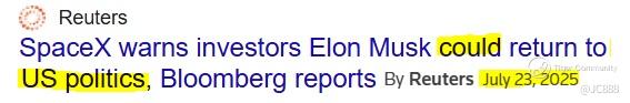 On Tue, 22 Jul 2025, it was reported that a recent SpaceX document (to investors) contained a warning that Musk may re-enter US politics.