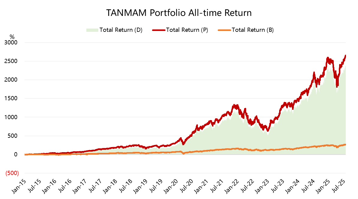 The "Magnificent Seven" portfolio ("TANMAMG" – Equal Weighted, rebalanced quarterly) has significantly outperformed the $SPDR S&P 500 ETF Trust(SPY)$ $S&P 500(.SPX)$ since 2015: