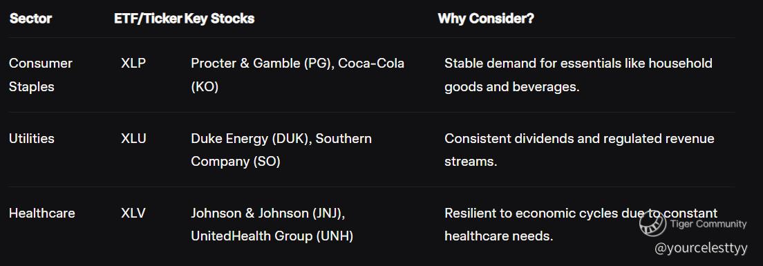 Defensive sectors—consumer staples, utilities, and healthcare—are known for their resilience during market downturns due to their focus on essential goods and services. The recent strength in these sectors, as tech stocks weakened, suggests investors are already rotating into safer assets. Here’s a breakdown of key defensive sectors and representative stocks: