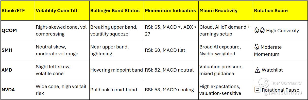 In the next section we will be showing how Qualcomm (QCOM) stacks up against SMH, AMD, and NVIDIA (NVDA) using a structured rotation heatmap overlay, integrating volatility cones, momentum scoring, and macro-reactive signals from the post-earnings and trade-driven rally.