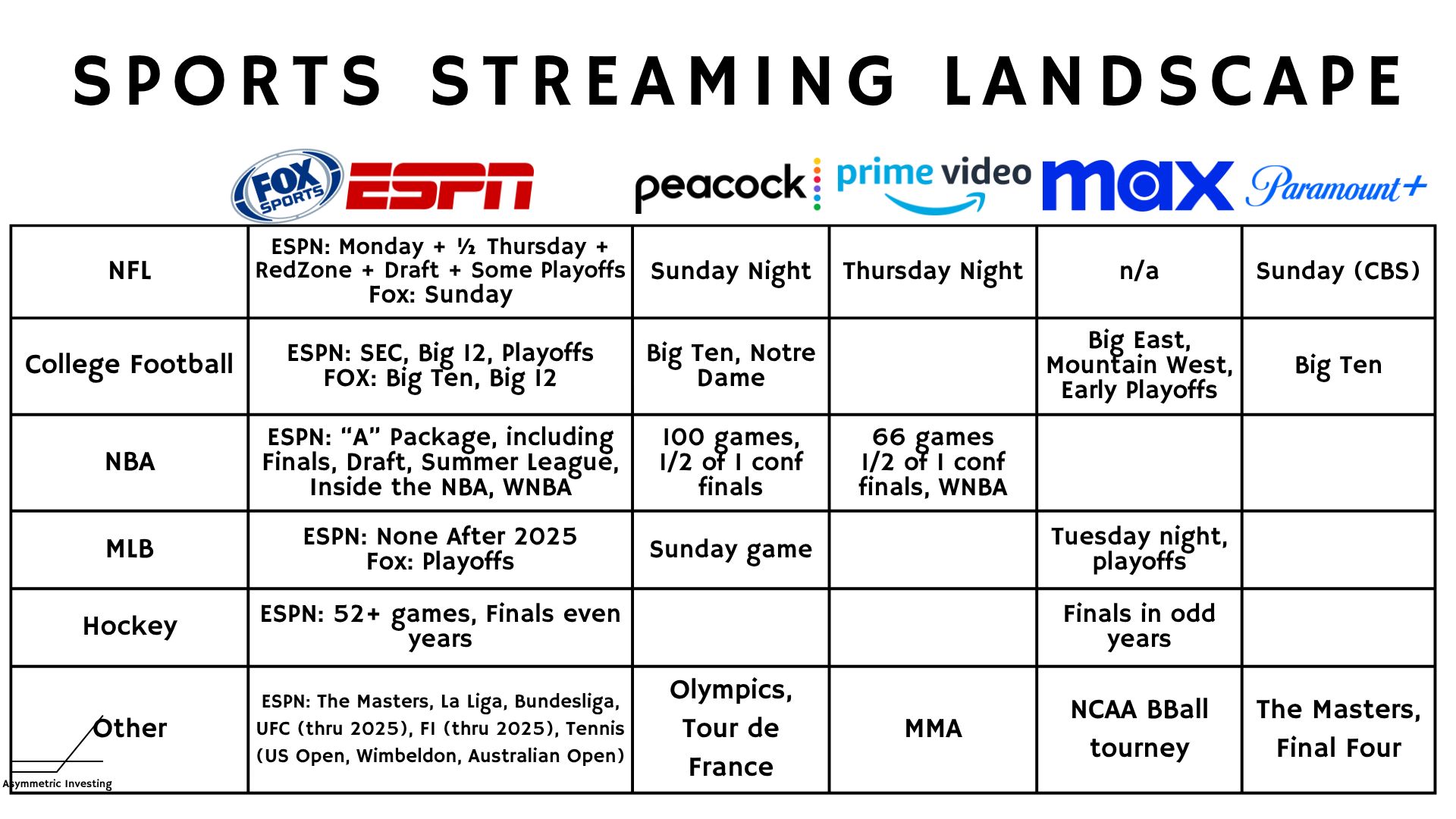 And if ESPN gets more games and RedZone, I think it solidifies Disney as the king of sports content and the only must-have for sports fans. As that attracts more subscribers and higher revenue per subscriber, it will be a reinforcing feedback loop for Disney/ESPN as rights partners.