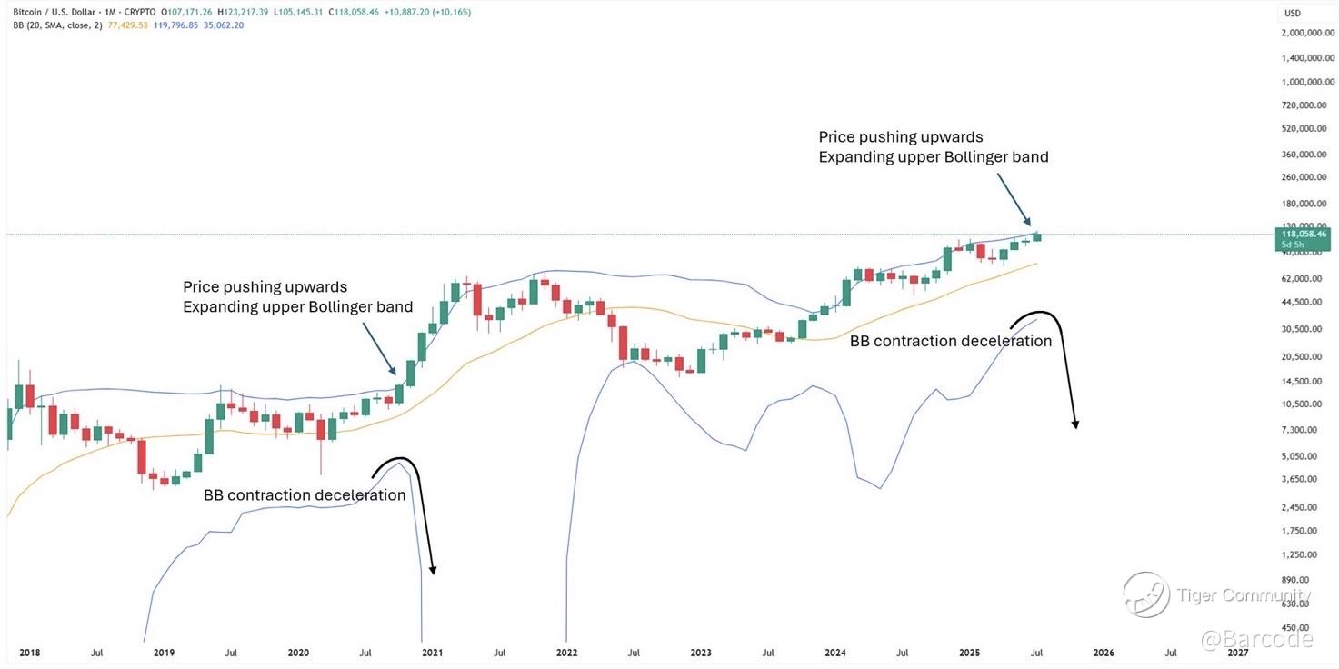 On the macro, $BTC is holding at $119,565.14, and while the move has been less explosive (+1.35%), it’s structurally significant. The monthly Bollinger Band is coiling, and we’re now seeing classic signs of contraction deceleration. Historically, that has preceded major expansions, like in late 2020. The upper band is now flattening just as price is pressing against it. If we get follow-through in August, the monthly BB expansion could trigger a volatility wave toward $132,000+.