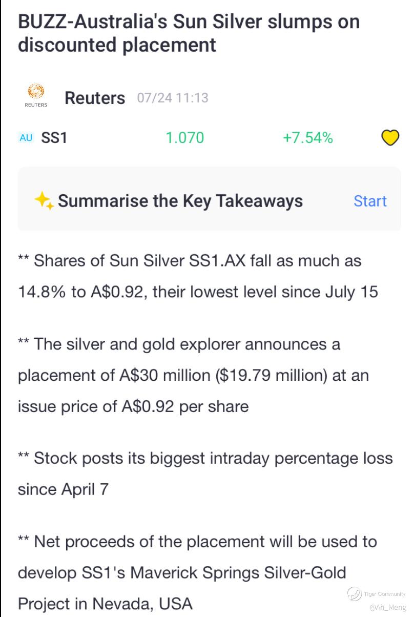 $Sun Silver Ltd(SS1.AU)$ This is what I would call strength... despite dropping initially like so many others when raising funds for development or working capital, the share price has rebounded quickly.