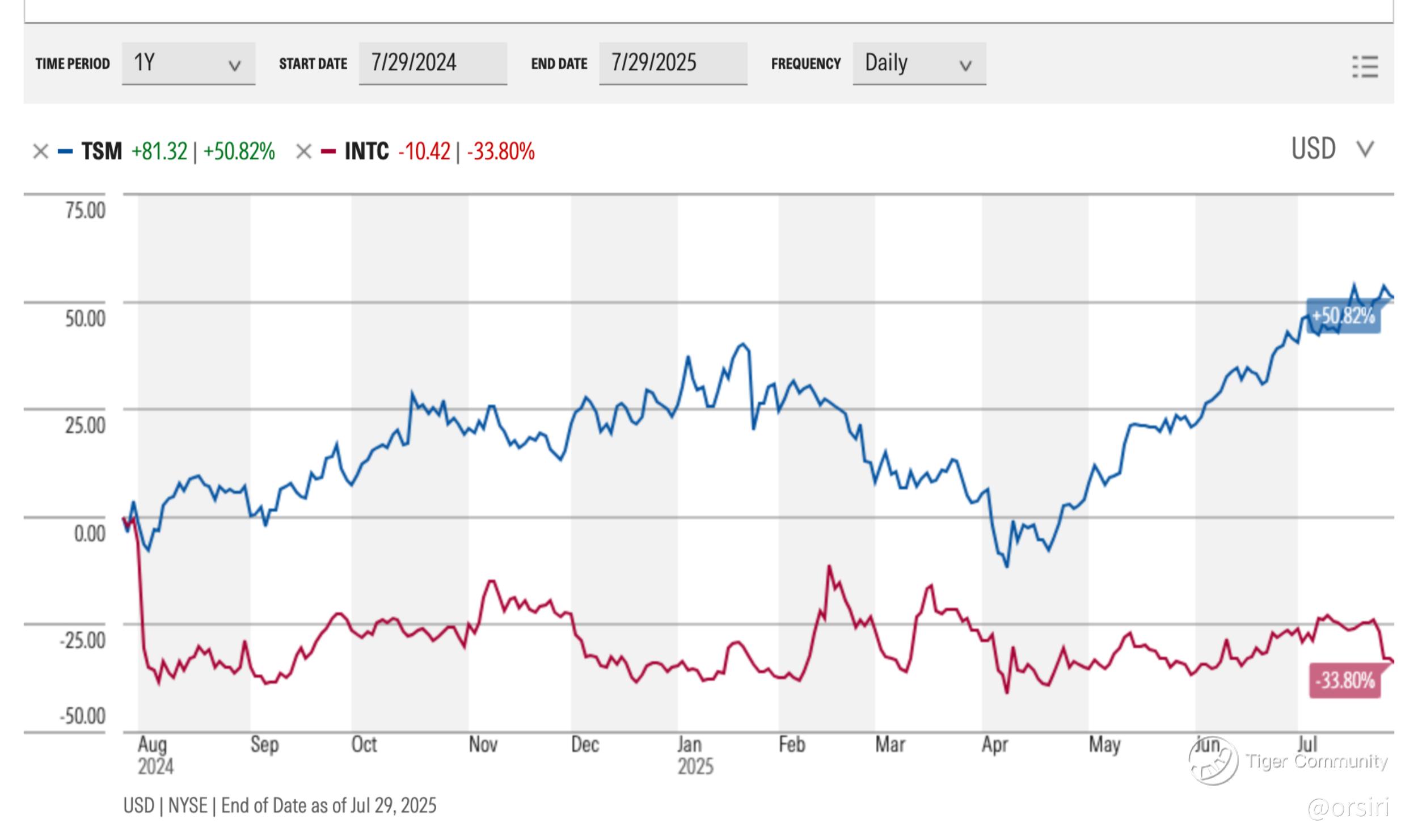 Over the past year, TSMC has surged while Intel has slumped—underscoring the market’s growing conviction in Taiwan’s technical lead.