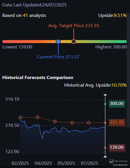 Based on 41 analysts from Tiger Brokers offering 12 month price targets for Apple in the last 3 months. The average price target is $231.35 with a high forecast of $300.00 and a low forecast of $139.00. The average price target represents a 9.51% change from the last price of $211.27.