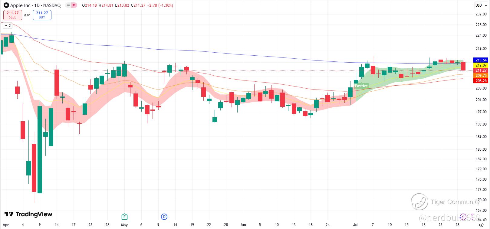 Apple has earnings on Thursday, on Tuesday, it was down 1.3% getting rejected again from resistance 221 down to 213. But we should not be concerned with this short-term price action, as it does not matter, though it might be impacted from moves on $Meta Platforms, Inc.(META)$ and $Microsoft(MSFT)$ when Wednesday, they have earnings.