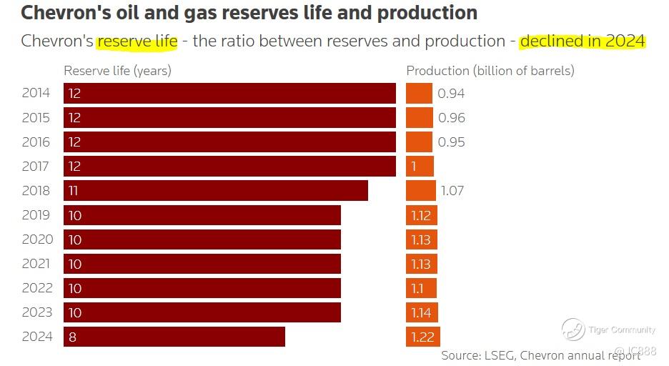 In 2024, its reserve replacement ratio slid to negative -4%, with reserves falling to their lowest point in at least a decade at 9.8 billion barrels.