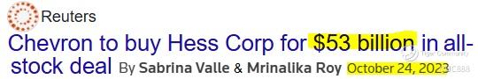 Chevron responded quickly, announcing on 23 Oct 2023, that it had agreed to acquire Hess, 12 days after Exxon's Pioneer deal. (see above)