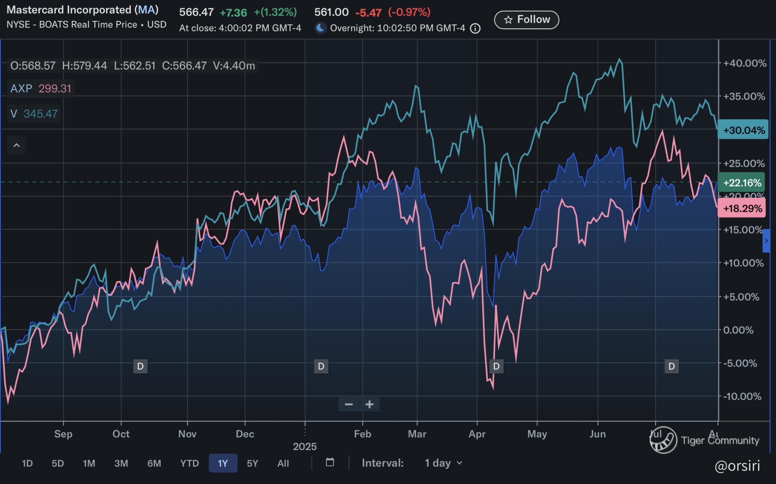 Against Visa, Mastercard trades slightly richer because it is executing more aggressively in cross-border and value-added services. $Visa(V)$ remains more domestic-volume heavy and conservative in guidance. $American Express(AXP)$ captures premium spend more directly but is saddled with credit risk and tighter rate sensitivity. $MasterCard(MA)$ occupies a middle lane: the global reach of Visa, the premium tilt of AmEx, and a cleaner earnings profile than either.