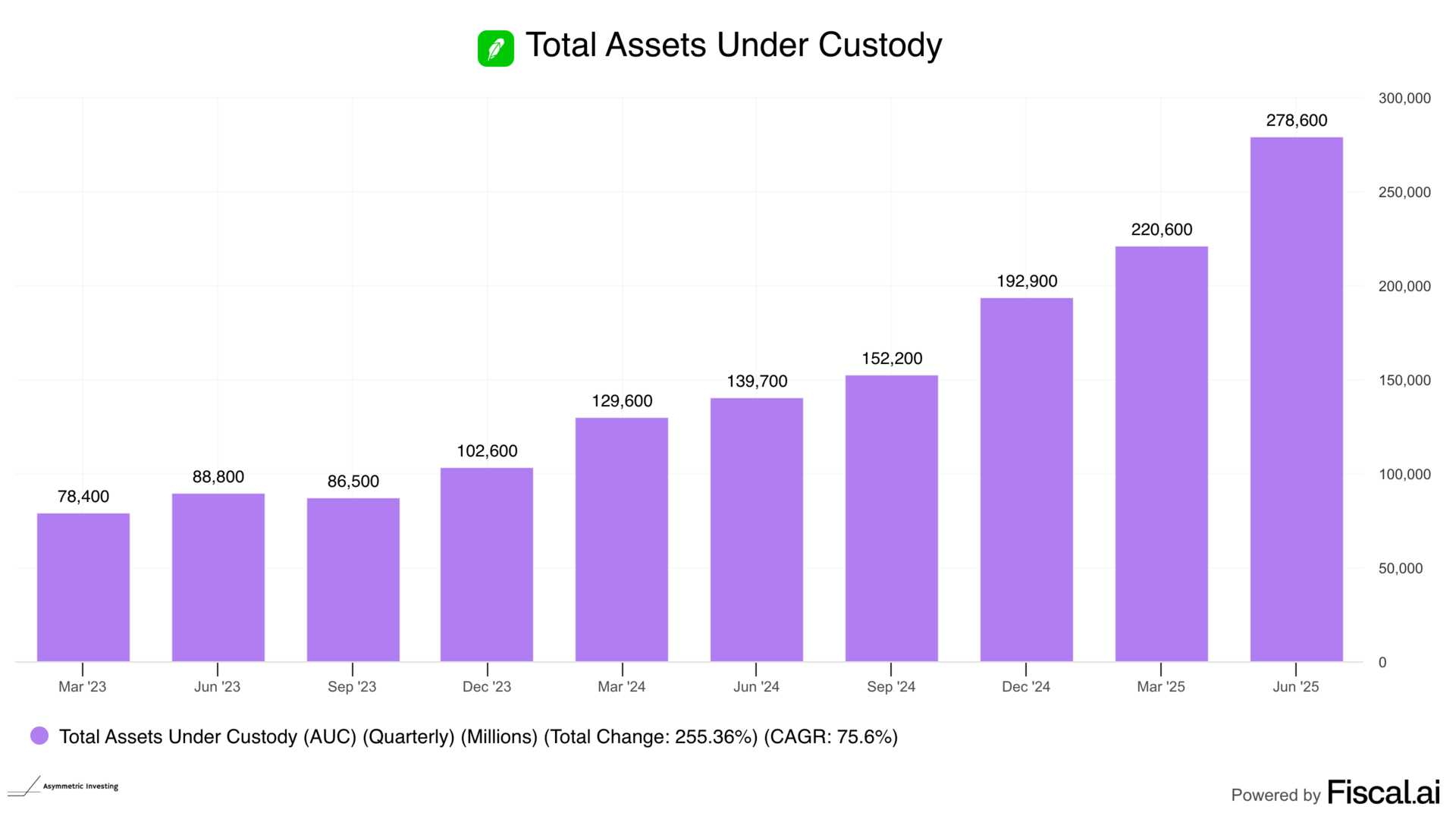 Maybe the best indicator of long-term health is total assets under custody, which you can see is stepping up each quarter (helped by a rising market).