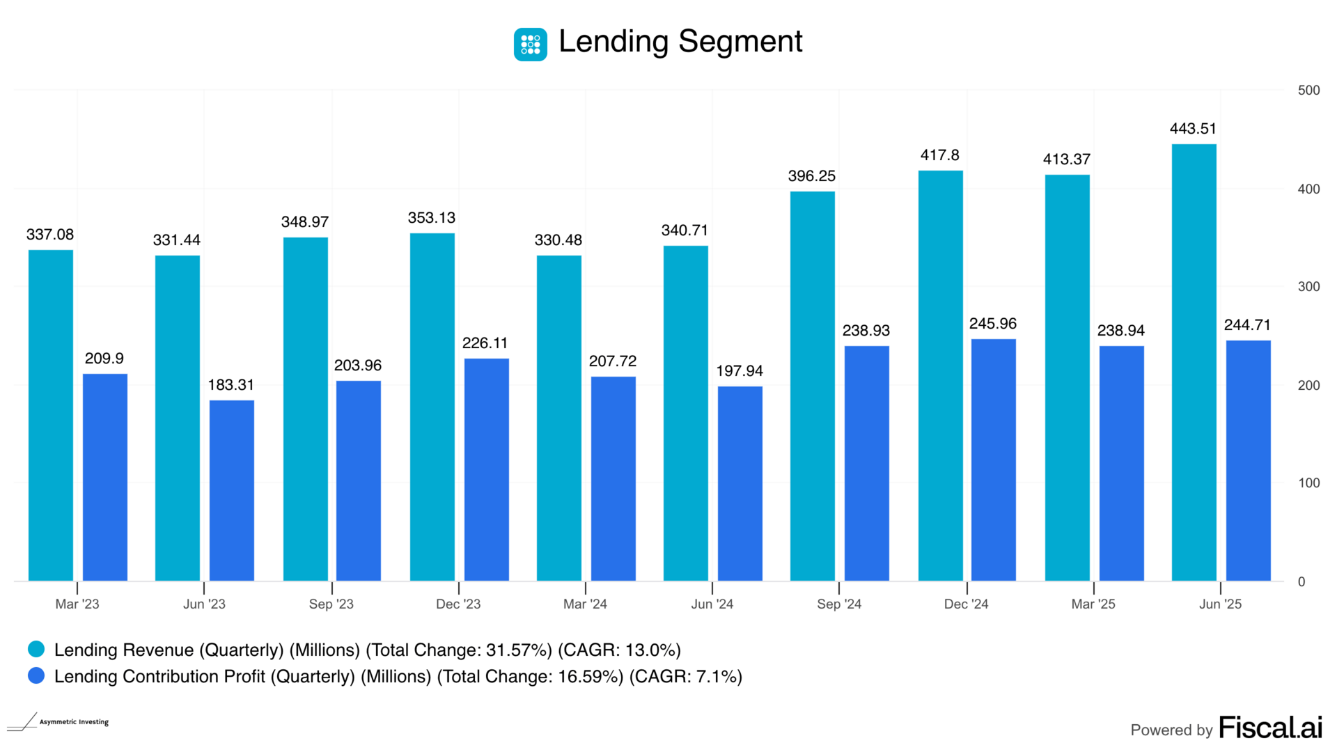 The lending segment continues to get the most attention because it’s the “bank” part of SoFi and carries the most risk. Total net revenue was up 30% in the quarter, and contribution profit was up 24%. I will note, lending doesn’t include revenue from the loan platform business (LPB), where SoFi originates loans on behalf of outside investors. That is a fee-based business without credit risk for SoFi, which I love as an investor, and we will see that growth in financial services below.
