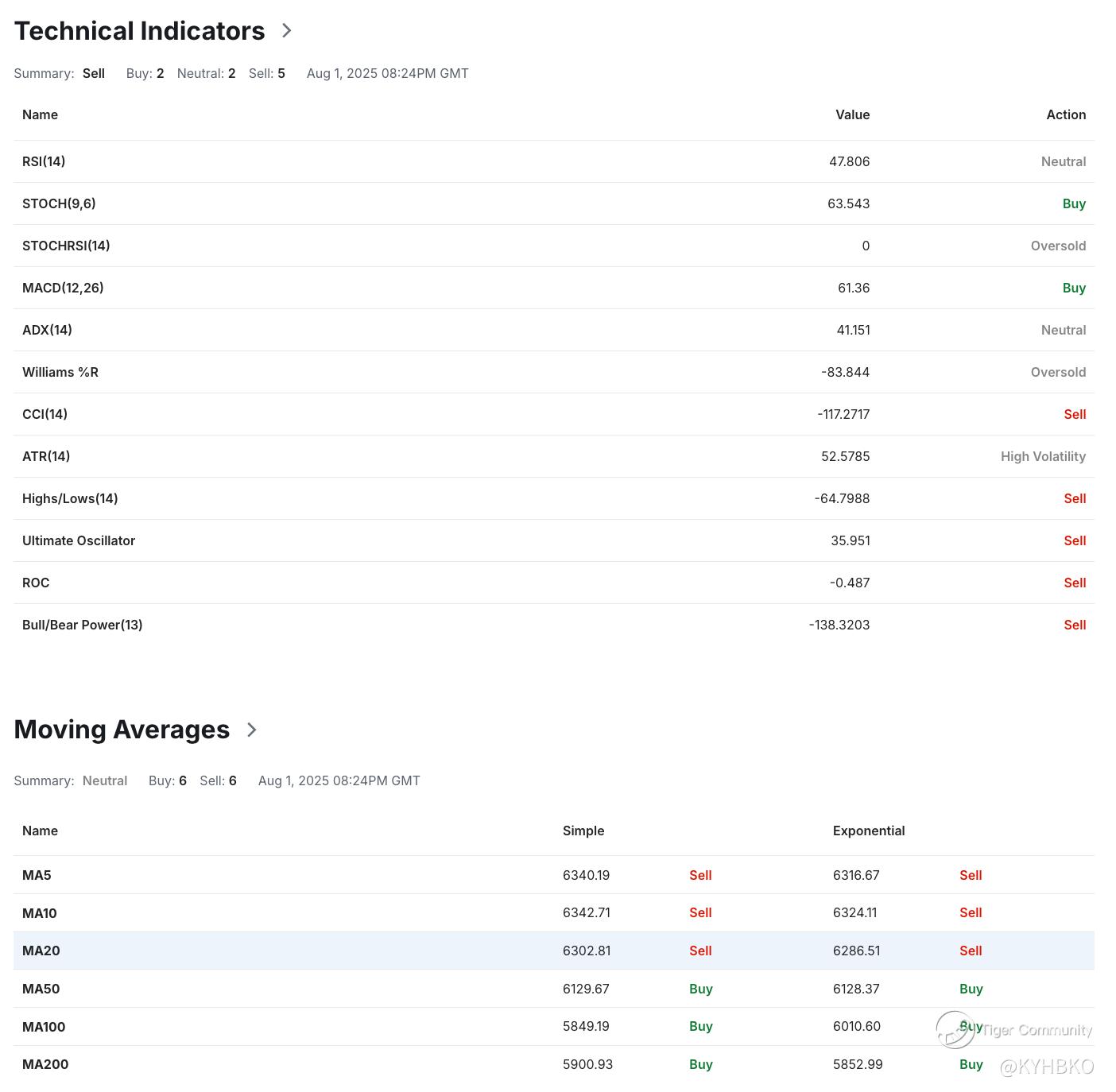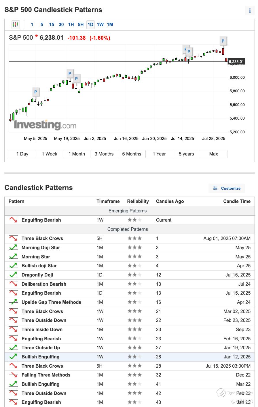 Short-Term Outlook (August 4–8, 2025): The S&P 500 is likely to continue its bearish trend into the coming week, driven by the Evening Star and Bearish Engulfing patterns. The price could test support at 5,629.83 (50 MA) or drop further to 5,500 if selling pressure intensifies. Potential scenarios include: