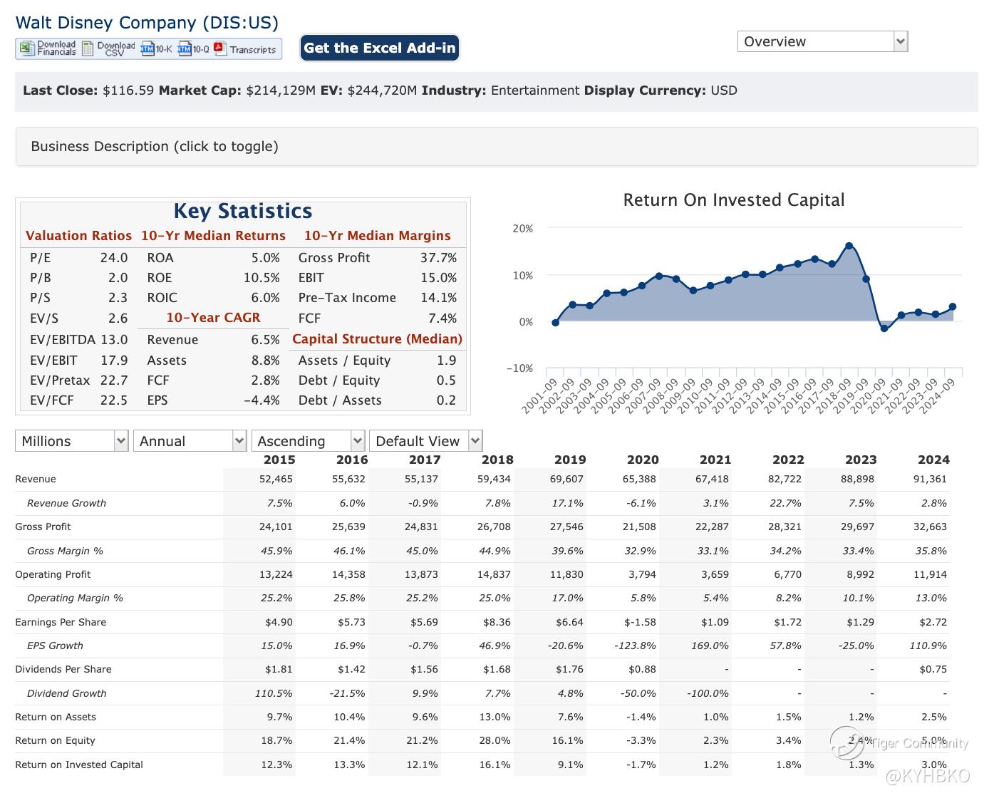 As of 2024, Disney's price-to-earnings (P/E) ratio is 24.0. The company's 10-year median free cash flow (FCF) margin is 7.4%, and its debt-to-assets ratio is a healthy 0.2.