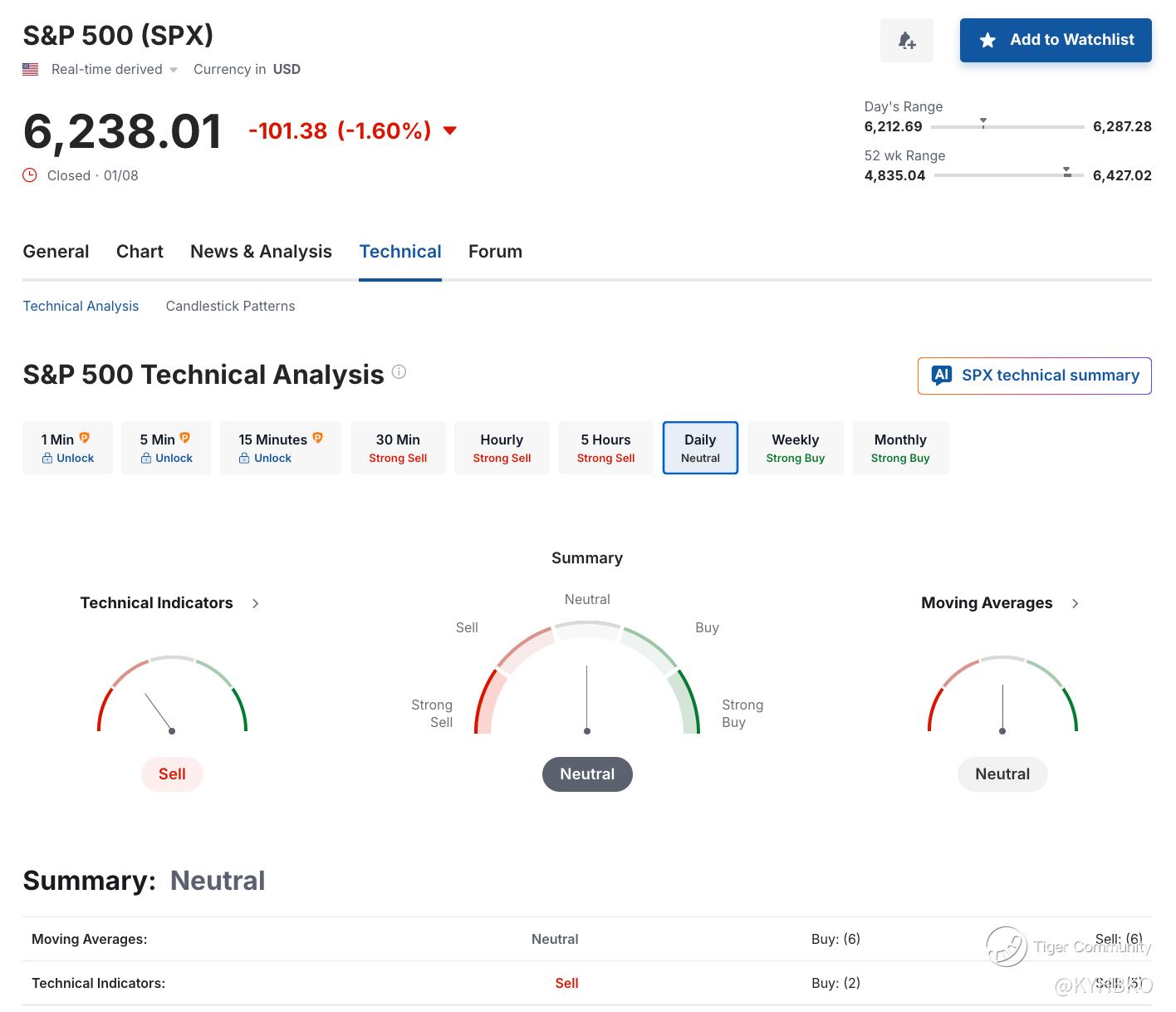 The S&P 500 (SPX) index is recommending a “Neutral” rating. 8 indicators show a “Buy” rating and 11 show a “Sell” rating based on the daily interval.