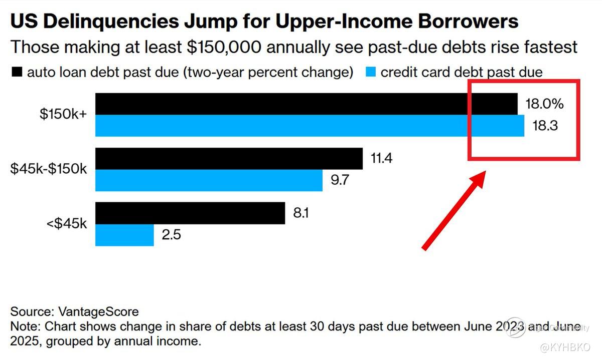 Delinquencies for high-income borrowers in the US are SURGING: Auto loan and credit card delinquencies (30+ days) from Americans making at least $150,000 annually have risen nearly 20% over the last 2 years. This is faster than for middle- and lower-income borrowers. - X user Global Markets Investor
