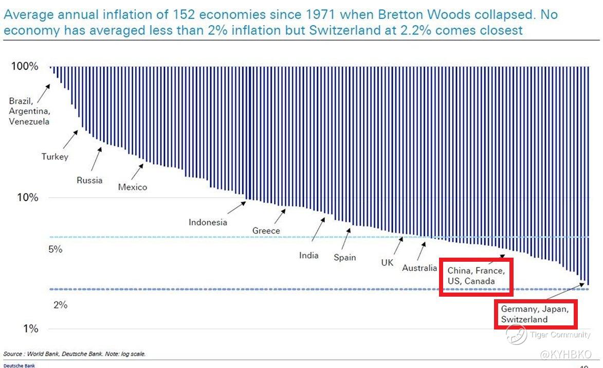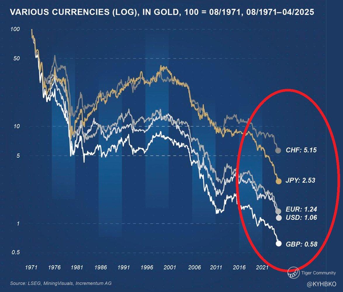 Currency debasement is not a bug — it’s a feature of the fiat system. Since Bretton Woods collapsed in 1971, not one of 152 countries has kept average inflation below 2%. Even Switzerland, the best performer, averaged 2.2%. Fiat money is in an eternal bear market. - X user Global Markets Investor