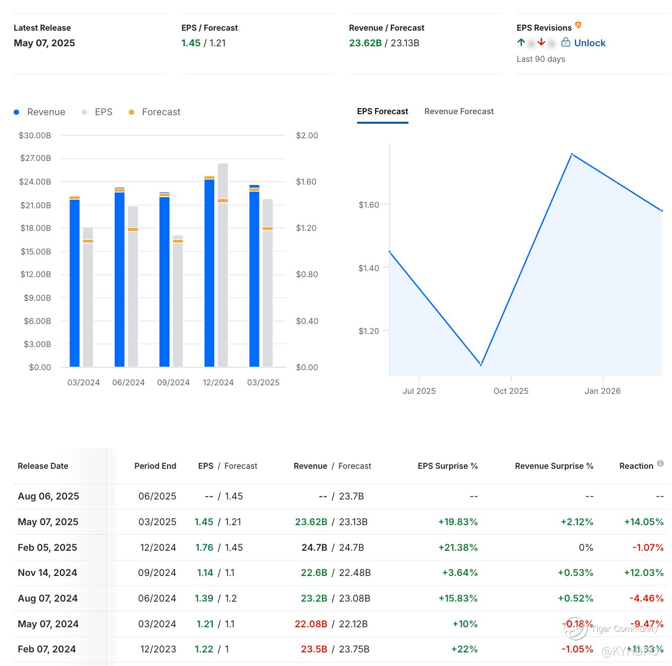 The market expects an EPS of $1.45 and revenue of $23.7B for the coming earnings.