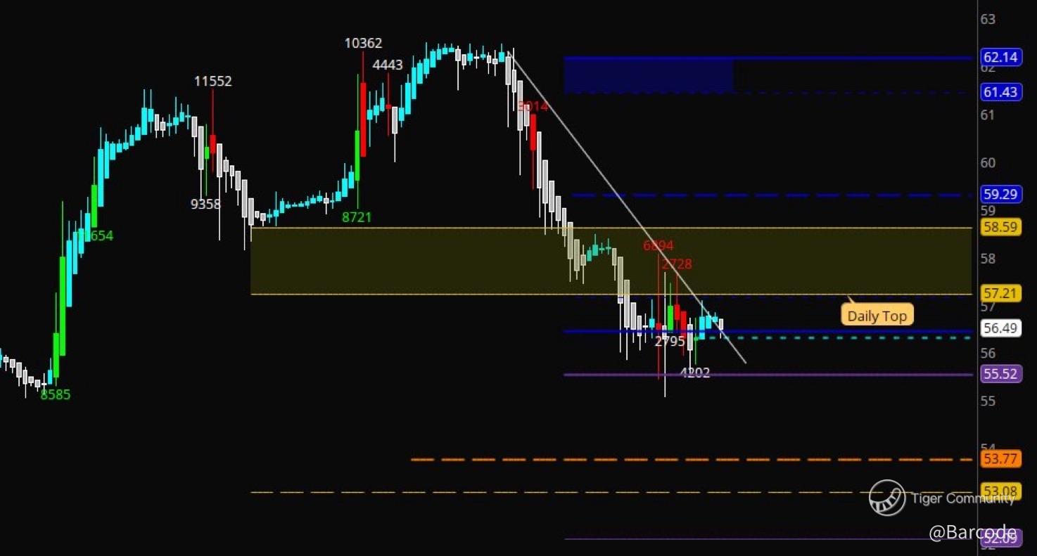 • Price now rides the 55 EMA ($56.36), compressing between the mid-Keltner band and Bollinger mean