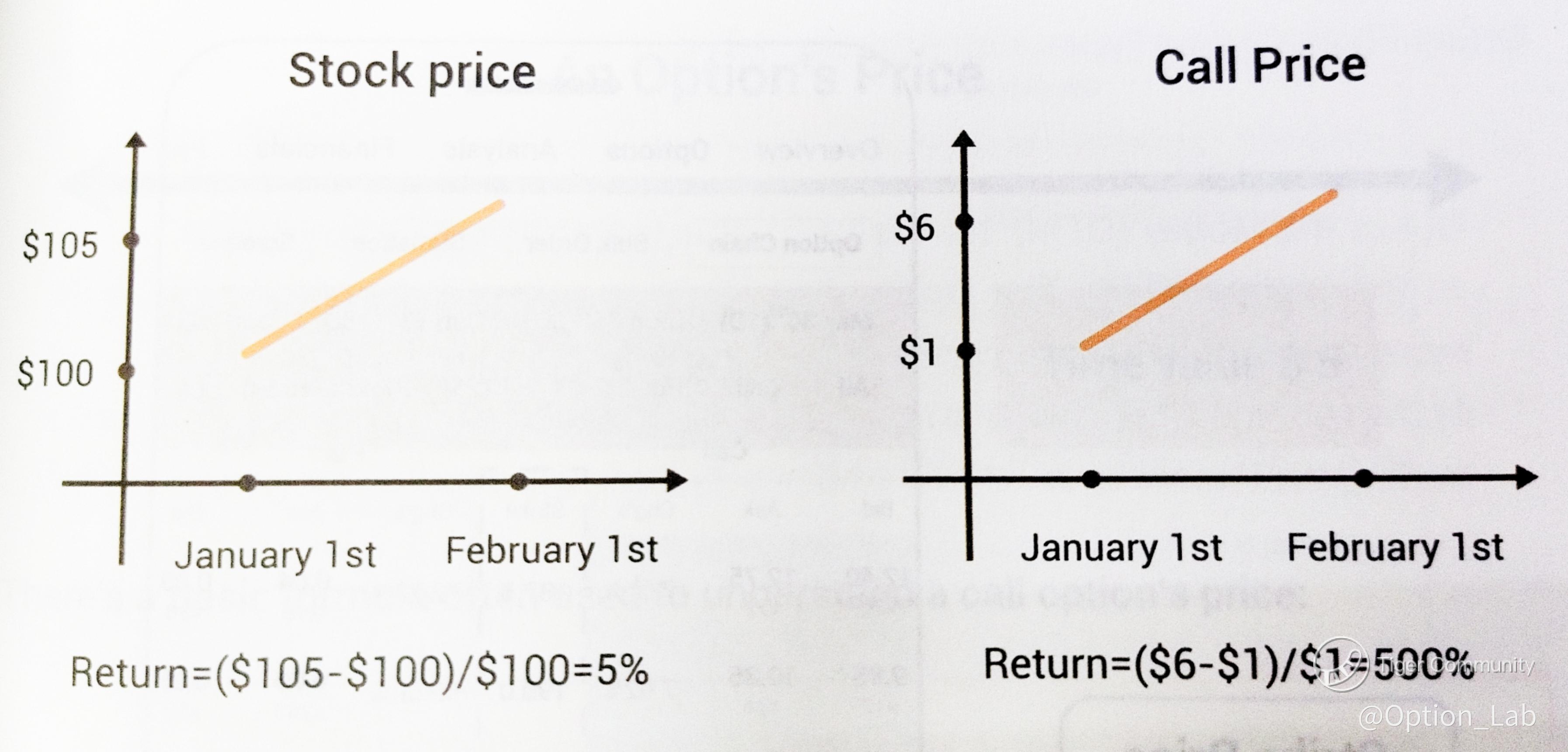 With $100 invested in a call, if the stock moves from $100 to $105, your option premium might rise to $6.