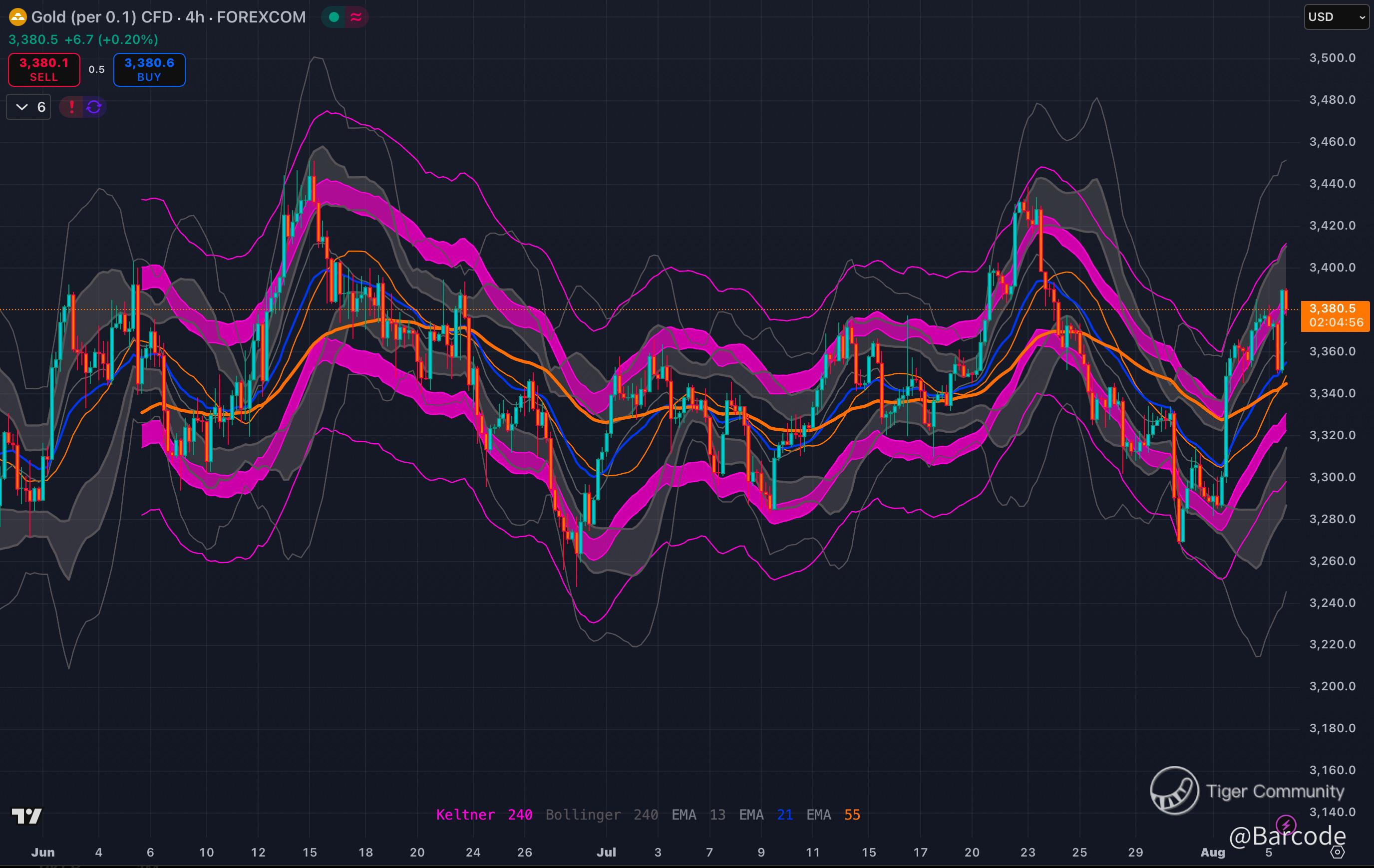 On the 4H chart, gold ($3,380.50) has just cleared a Keltner and Bollinger cluster, riding the upper bands with rising EMAs and narrowing volatility; typically a sign of trend continuation. MACD crossovers and RSI shifts support this bullish continuation unless it closes back below the 13EMA.