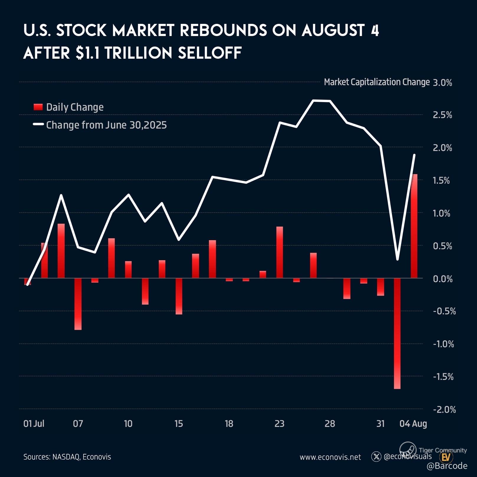 The U.S. stock market saw a $1.1 trillion evaporation on August 1 following weak job numbers and new tariff rhetoric. The sharp 1.7 percent drop was the steepest daily loss since Q1. But by August 4, a 1.6 percent recovery emerged, almost entirely retracing the selloff. Driving the rebound: renewed Fed rate cut expectations, mega-cap tech resilience, and a pullback in trade war fears.