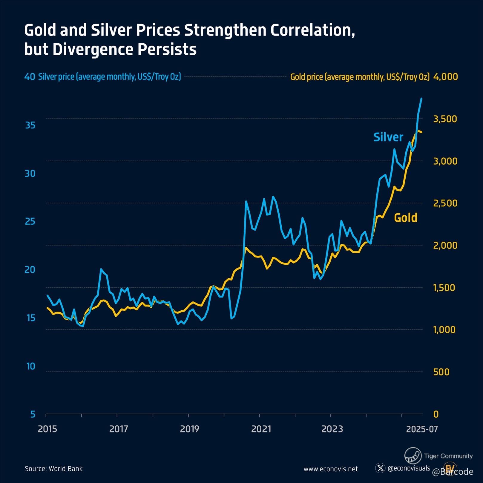 Since 2015, gold and silver have traded with a strong positive correlation. But from May to July 2025, silver has clearly taken the lead, surging 15.1 percent compared to gold’s modest 0.9 percent gain. This short-term divergence suggests speculative momentum is building around silver’s industrial demand and inflation hedge appeal. Gold’s slower ascent may reflect its role as a more defensive reserve asset, but the trend remains firmly upward with both now testing new highs.