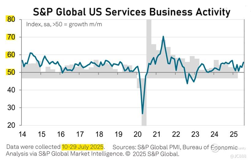 According to S&P Global, US service sector grew faster in July 2025, with business activity reaching its highest level in 2025, as more new orders came in. (see below)