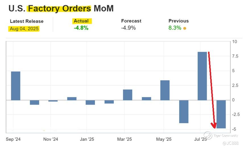 The latest number is -4.8%, (indicating US manufacturers received fewer new orders than May 2025) and is slightly better than the forecasted -4.9%.
