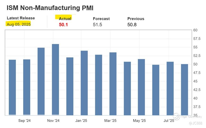 On Tue, 05 Aug 2025, ISM Non-manufacturing PMI came in at 50.1 vs economists’ forecast of 51.5 vs June 2025 ’s 50.8.