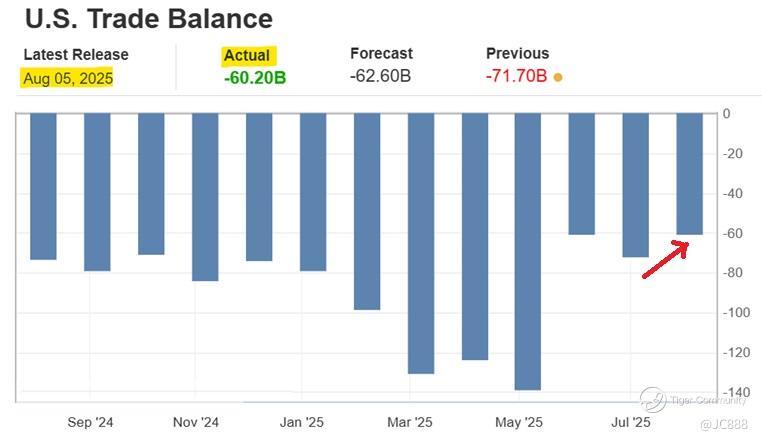 US trade deficit, that shows the gap between what US imports and exports, got smaller and did better than analysts’ estimates for June 2025. (see below)