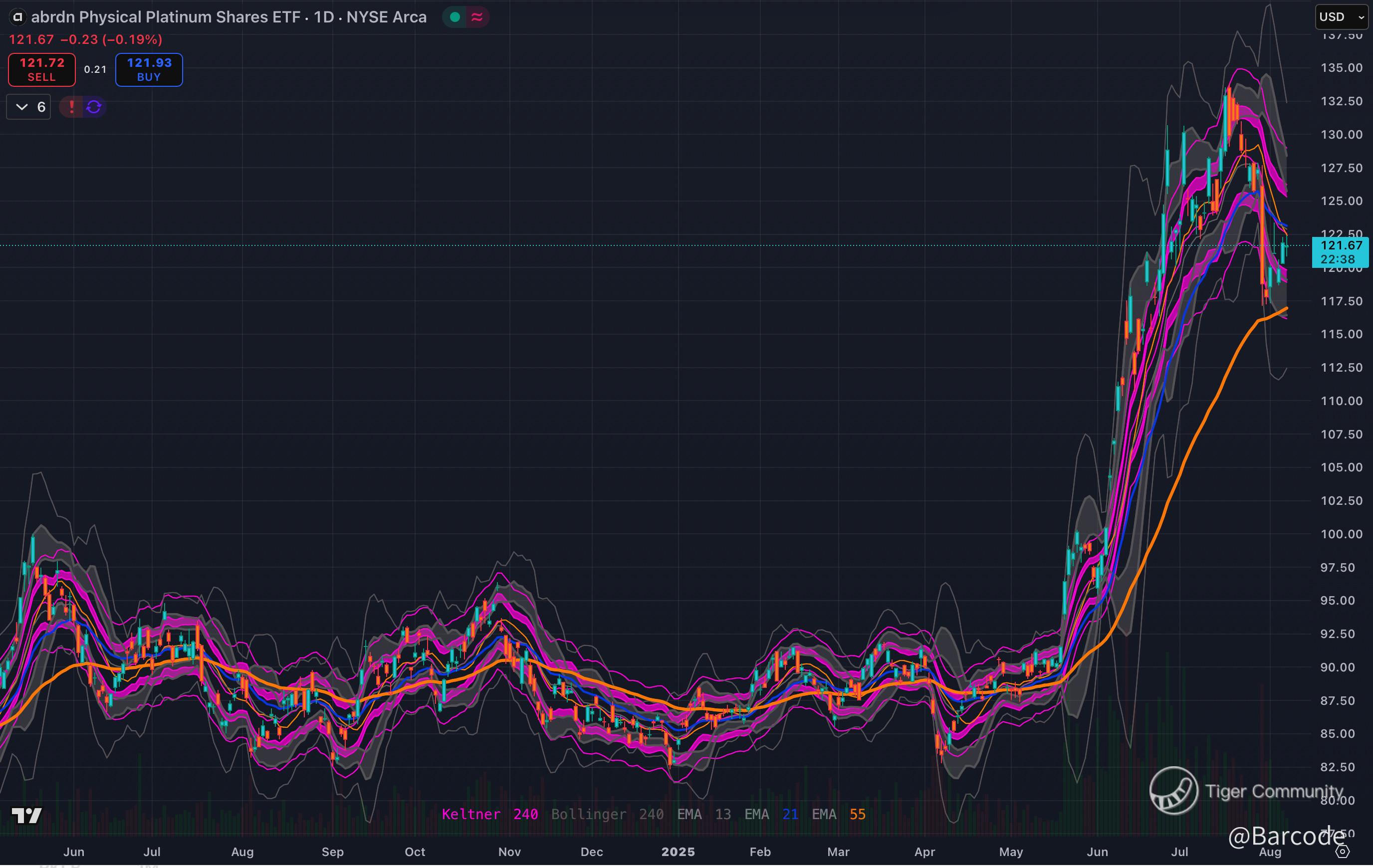 • The abrdn Physical Platinum Shares ETF ($PPLT) mirrors this move. From a base around $95 in early June, it surged to a local high of $133.80 before consolidating near $121.67. Weekly RSI is holding above 60, and MACD just crossed into bullish territory.