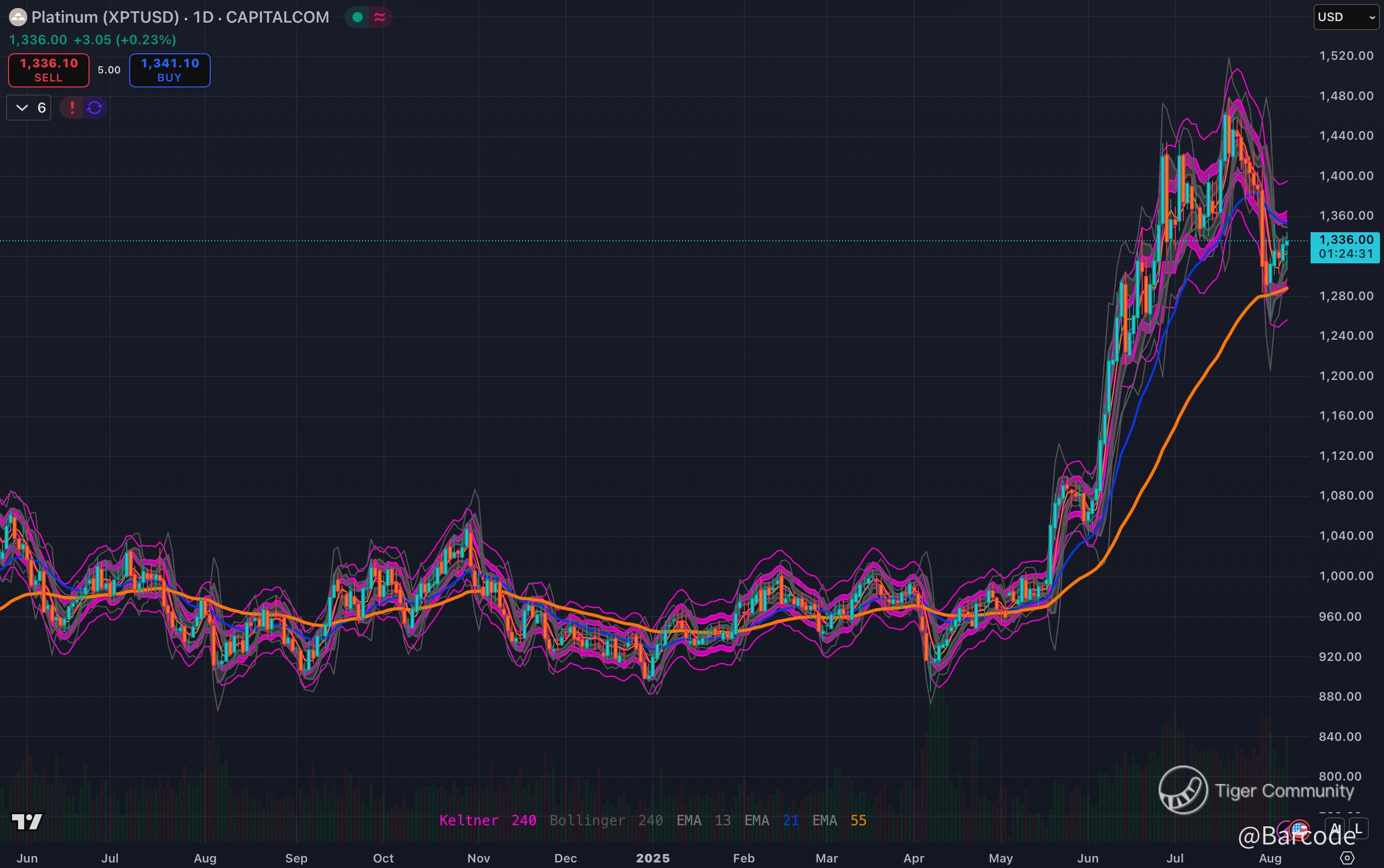 • Platinum spot (XPTUSD) hit $1,336 today after bouncing off the $1,280 support zone with textbook volume confirmation. The daily chart shows support on the 55 EMA with compression across Keltner and Bollinger bands. RSI is curling higher from neutral. MACD is narrowing into crossover formation.