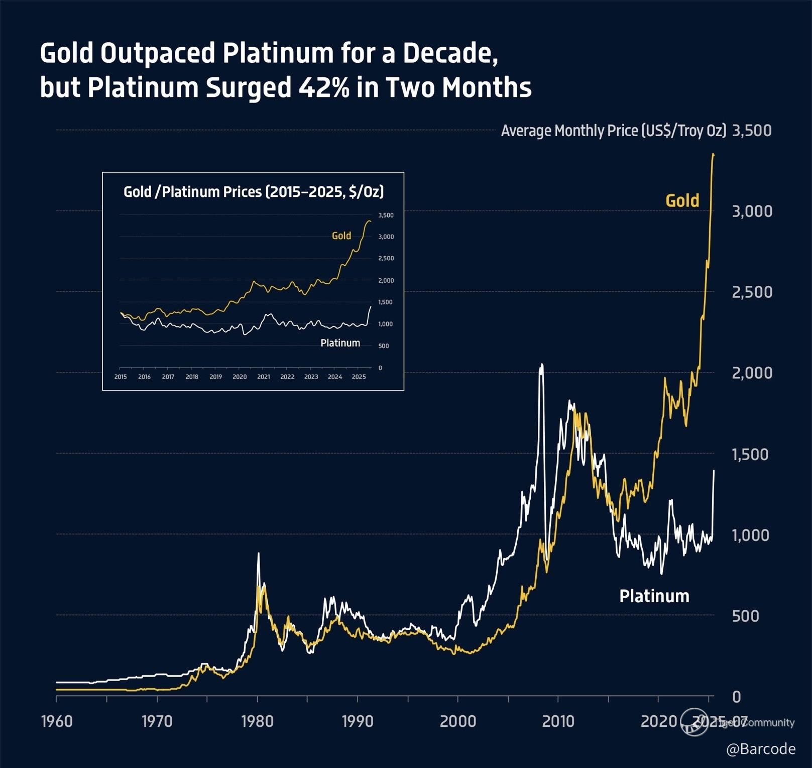 🤔 Can platinum reclaim its premium over gold? It hasn’t traded above gold since 2015, but the setup now feels eerily similar to 2008, when platinum roared back from obscurity and outperformed gold by 2.5× within 12 months.