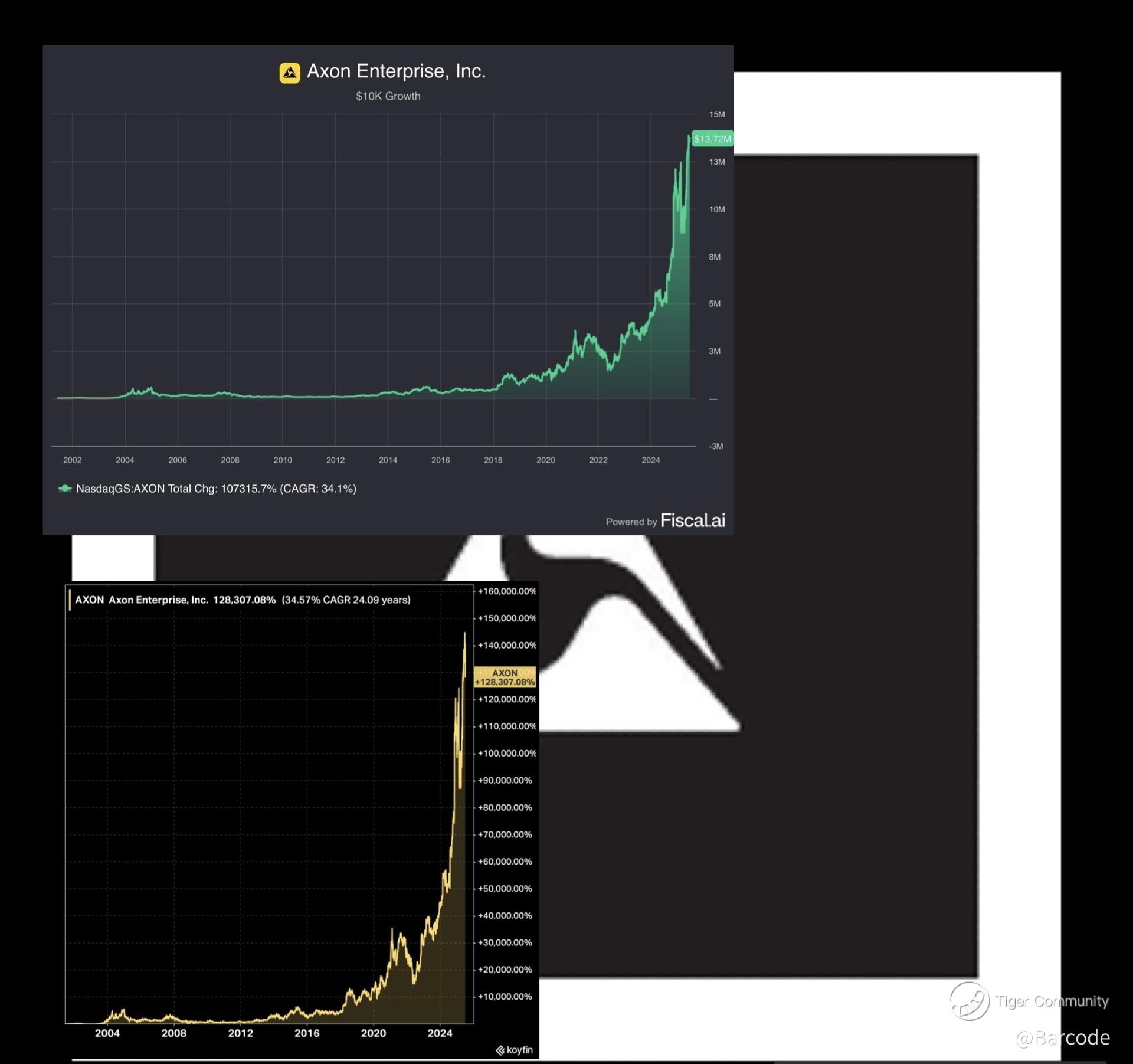 Iβm leaning into Axon Enterprise with deliberate conviction. This is the second-best performing stock of the last 25 years, turning $10,000 at its 2001 IPO into $13.7M today. CAGR has been extraordinary across timeframes: 34.6% since inception, 23.8% over 20 years, 42.0% over 15 years, 36.65% over 10 years, and 50.0% over the last 5 years. Koyfin plots long-term total return at +128,307.08% with a 34.57% CAGR across 24.09 years. This is the definition of operational excellence compounded over decades.