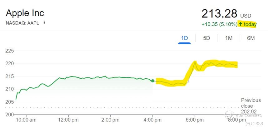 On Wed, 06 Aug 2025, shares of AAPL, jumped +5.1%. to $213.28 per share (see below)