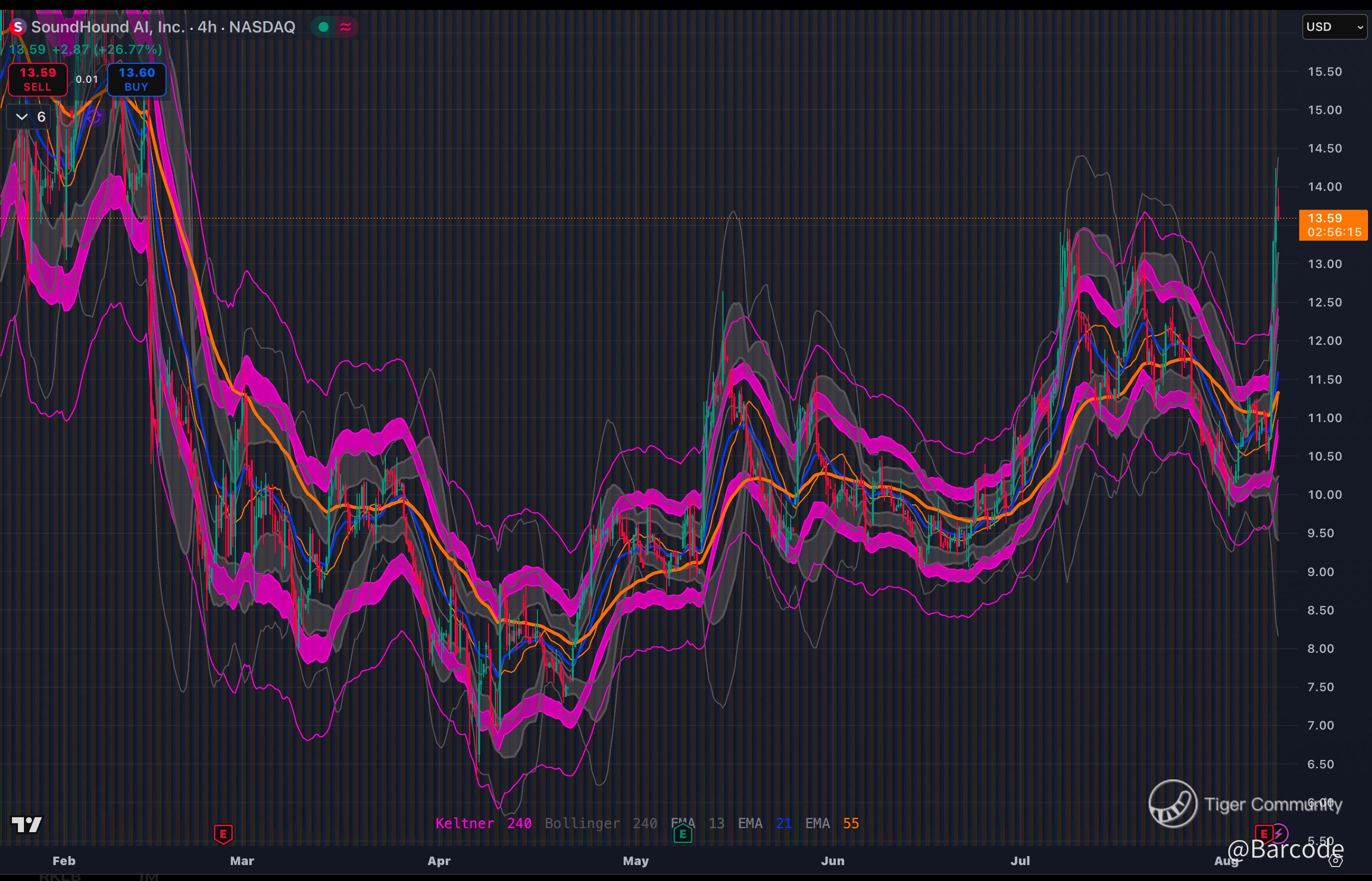 SoundHound AI’s Q2 2025 numbers executed with surgical precision: $42.7M revenue (+217% YoY) versus $32.9M consensus ignited a +28.17% gap and +32.25% intraday surge. Price confirmed a wedge breakout with MACD positive, RSI ~71 acting as a volatility trigger, and the 50MA anchoring support. A 40% short float, 126M shares short, and 3.33 days to cover amplify the potential. A decisive $14.70 break on >60M shares could unlock $16.50 quickly, with the $24.98 high back in scope if execution persists.