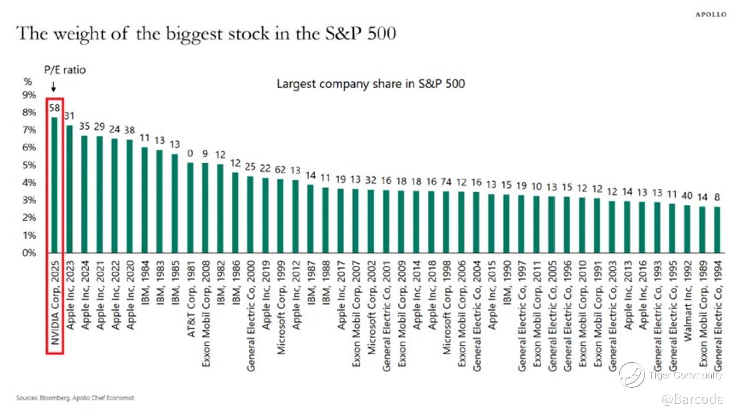 $NVIDIA(NVDA)$ $S&P 500(.SPX)$ $Apple(AAPL)$ π€―π₯π Nvidia is dominating the S&P 500 more than any company in at least 44 years! $NVDA now makes up 8% of the S&P 500. The only other company to exceed 7% in the past was Apple in 2023. Not even the 2000 Dot-Com Bubble saw a stock dominate the S&P 500 to this extent.For example, in 1999 and 2000, Microsoft and General Electric each accounted for ~4% of the S&P 500. Furthermore, IBM's record share of the index was ~6% in 1984.