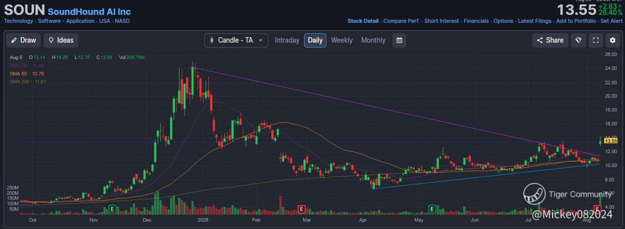 SoundHound reported a record second quarter, posting revenue of $42.7 million, an increase of roughly 217% year-over-year, and raised its full-year revenue outlook to a range of $160–$178 million. The company says growth is broad-based across automotive voice platforms, enterprise AI for customer service and restaurant automation. These topline beats and the raised guidance drove the immediate surge in the stock.