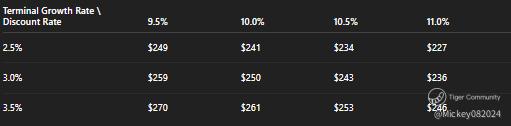 Even in the most conservative case (2.5% terminal growth, 11% discount rate), the valuation exceeds $225 per share.